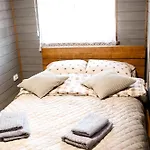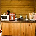 The kitchen amenities at the Rostoki accommodation feature an electric kettle, a fridge, and kitchenware, provided in a dining area.